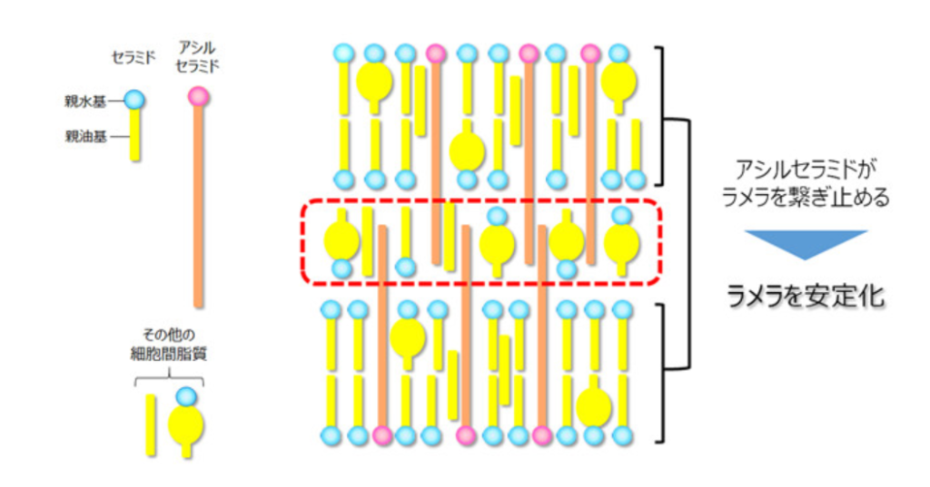 アシルセラミドは層をまたいで存在するので、セラミドのブックエンド的な役割をしていて、ラメラを整える役割を担っています。